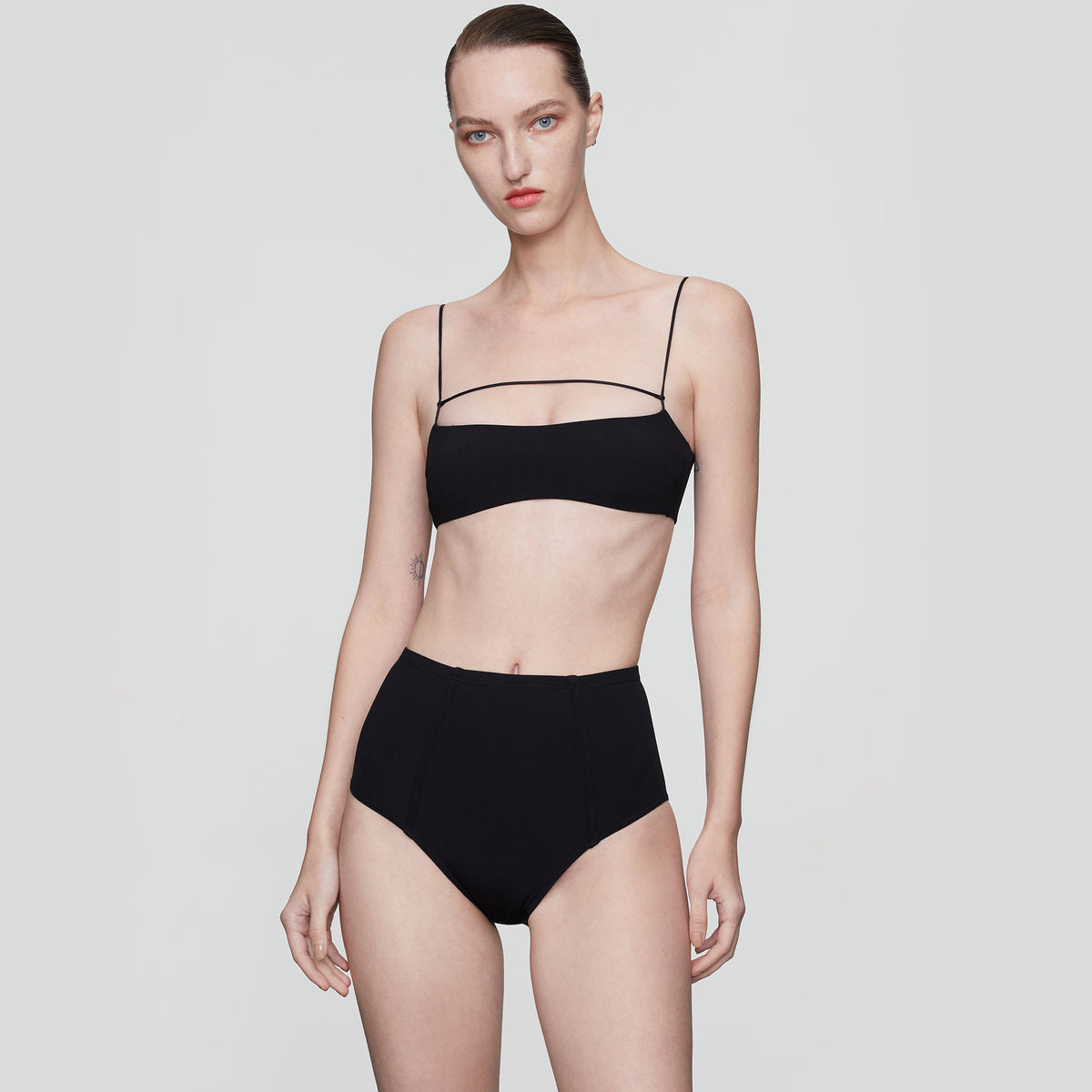 The "THE BEATS" series utilizes environmentally friendly recycled nylon yarn. The minimalist bandeau design paired with ultra-fine adjustable straps in front allows for easy creation of versatile styles. The thin straps can also be adjusted from the front to the back, adding a playful touch to the silhouette.