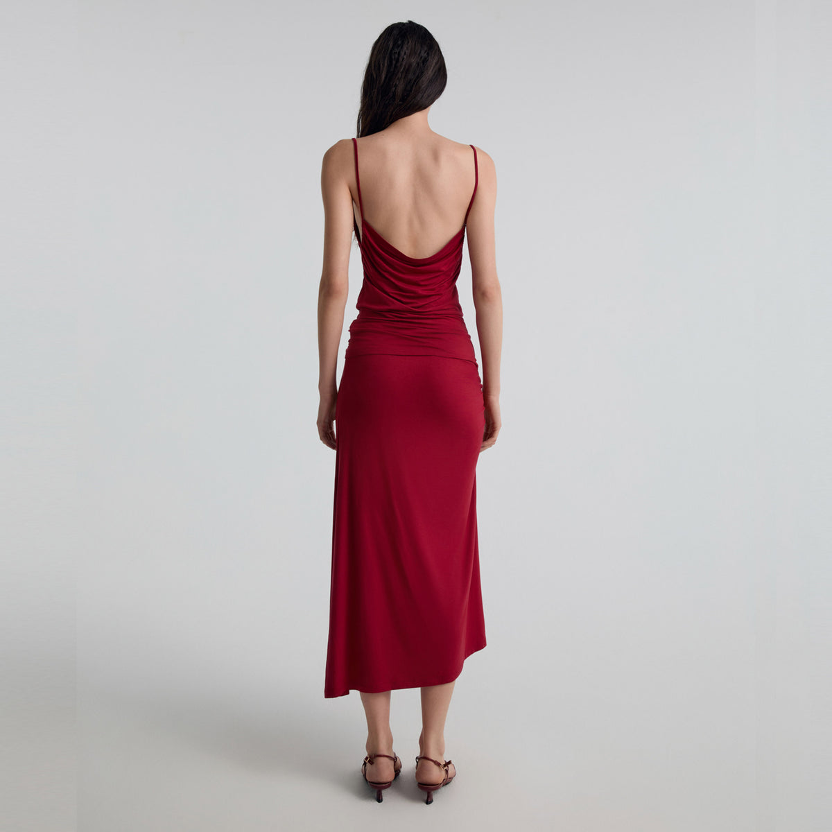 The pleated design reflects the aesthetics of Bauhaus style, and the structured, high-elastic draped texture creates smooth and flowing body lines for an easy and comfortable feel.