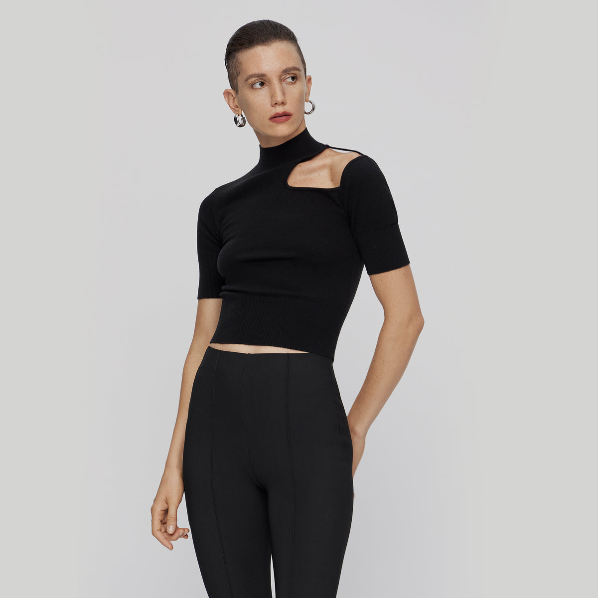 The cut-out shoulder design, integrates artistic aesthetics into daily clothes. Expressing the fashion attitude of contemporary women with Bauhaus style.