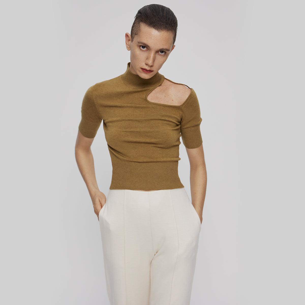 The cut-out shoulder design, integrates artistic aesthetics into daily clothes. Expressing the fashion attitude of contemporary women with Bauhaus style.