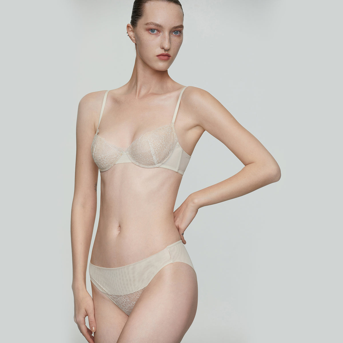 Made with selected delicate and high-quality Leavers eyelash lace, this bra features a 3/4 cup with memory wire to enhance the curves of the chest. It has ultra-thin shoulder straps and a simple back hook for a confident look.