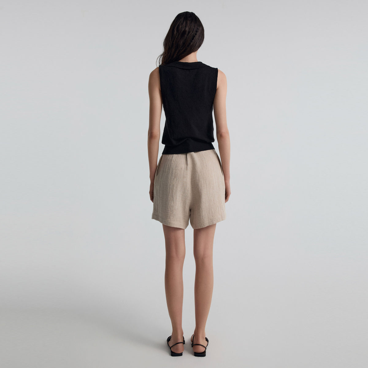 The linen-blend yarn and lapel design gracefully trace the neckline, while the deep V-cut exudes effortless elegance.