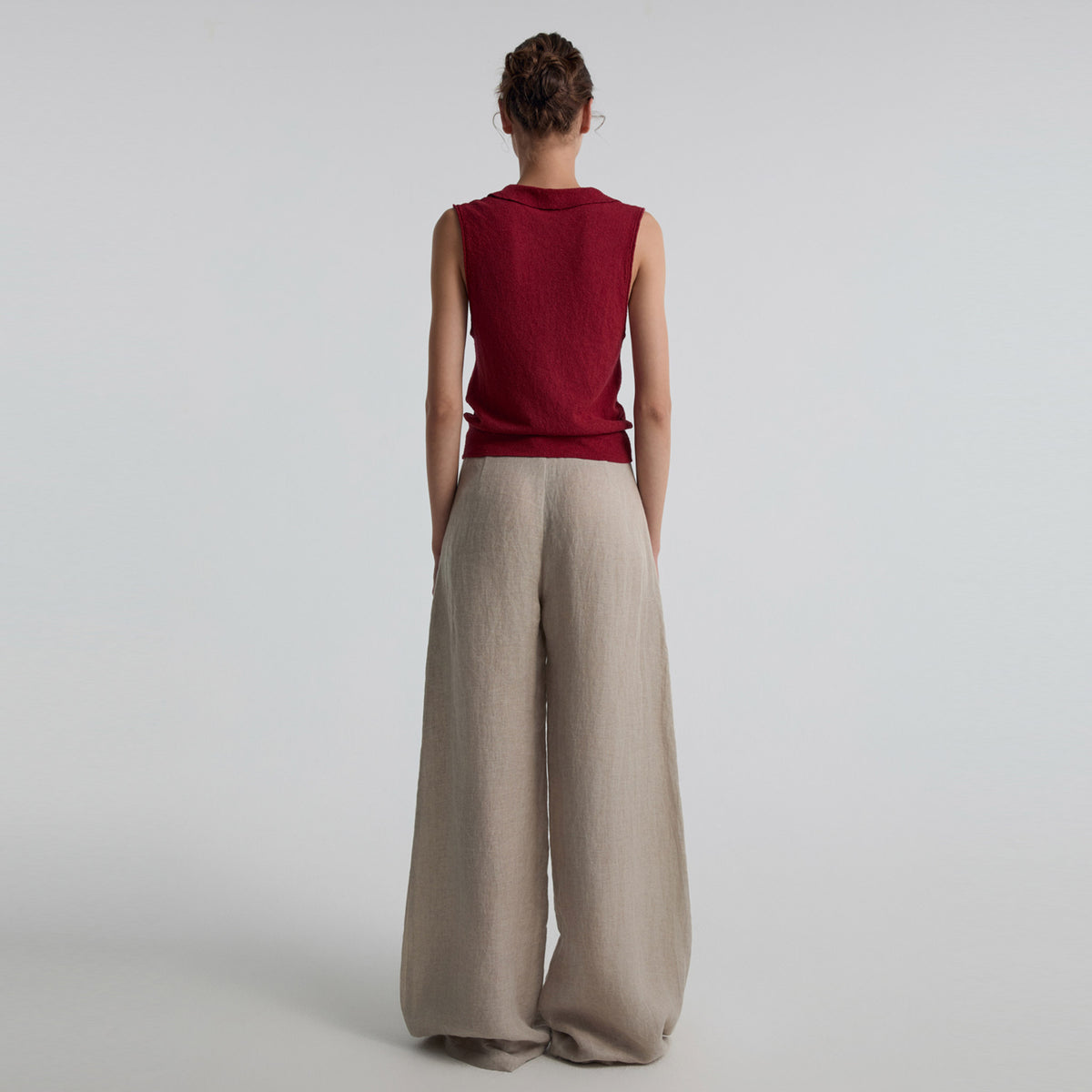 The linen-blend yarn and lapel design gracefully trace the neckline, while the deep V-cut exudes effortless elegance.