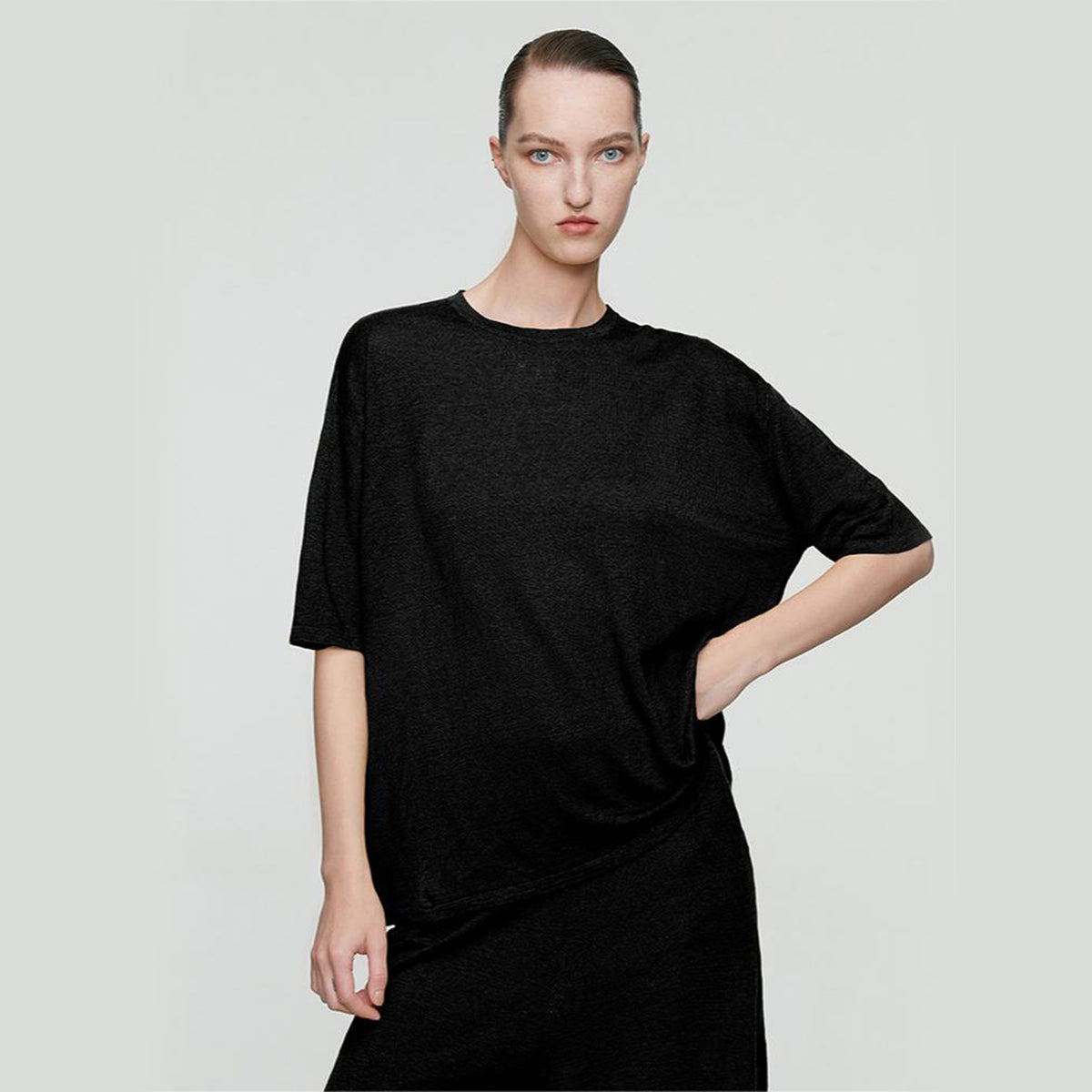 Employing a knitted technique with all-linen material brings a subtle sense of semi sheer. It can be paired with stylish lingerie, creating a simple and fashionable everyday look. The classic oversized fit and dropped shoulder design for enjoying the summer moments, making it suitable for both lounging at home and vacation wear.