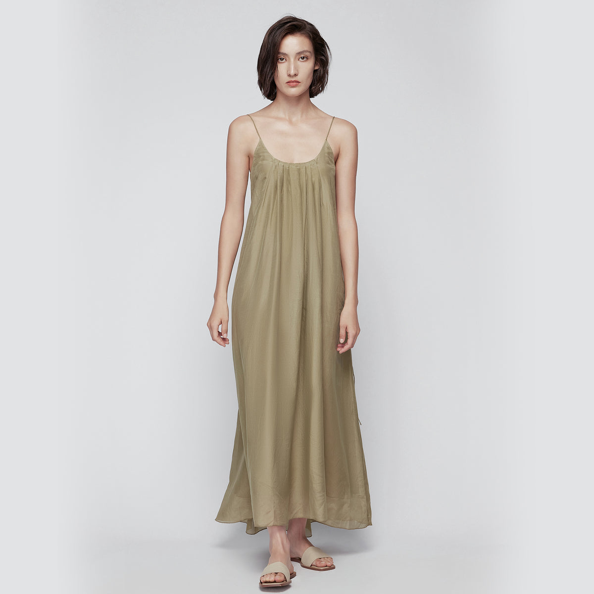 Delicate thin straps paired with a simple and smooth open-back design, gracefully reveals the enchanting skin, uniquely blurring the boundaries outwear and loungewear.