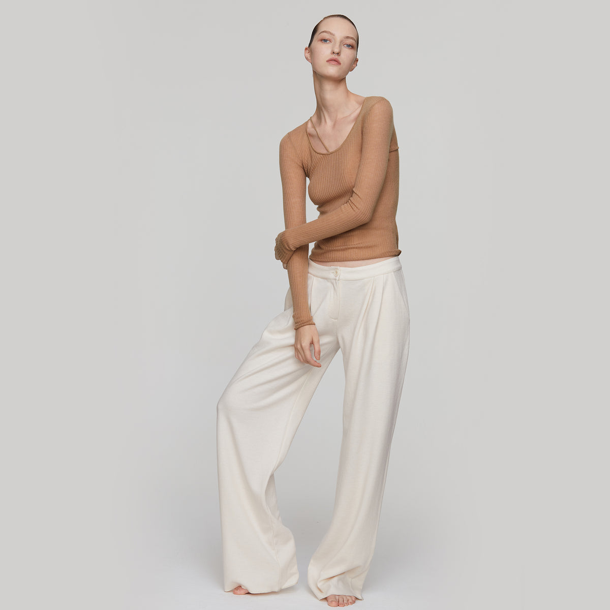 100% water-soluble wool which is comfortable, snug and gives you breathable warmth. The U-neck, paired with thin line detail, suitable for versatile wear at home or outside.