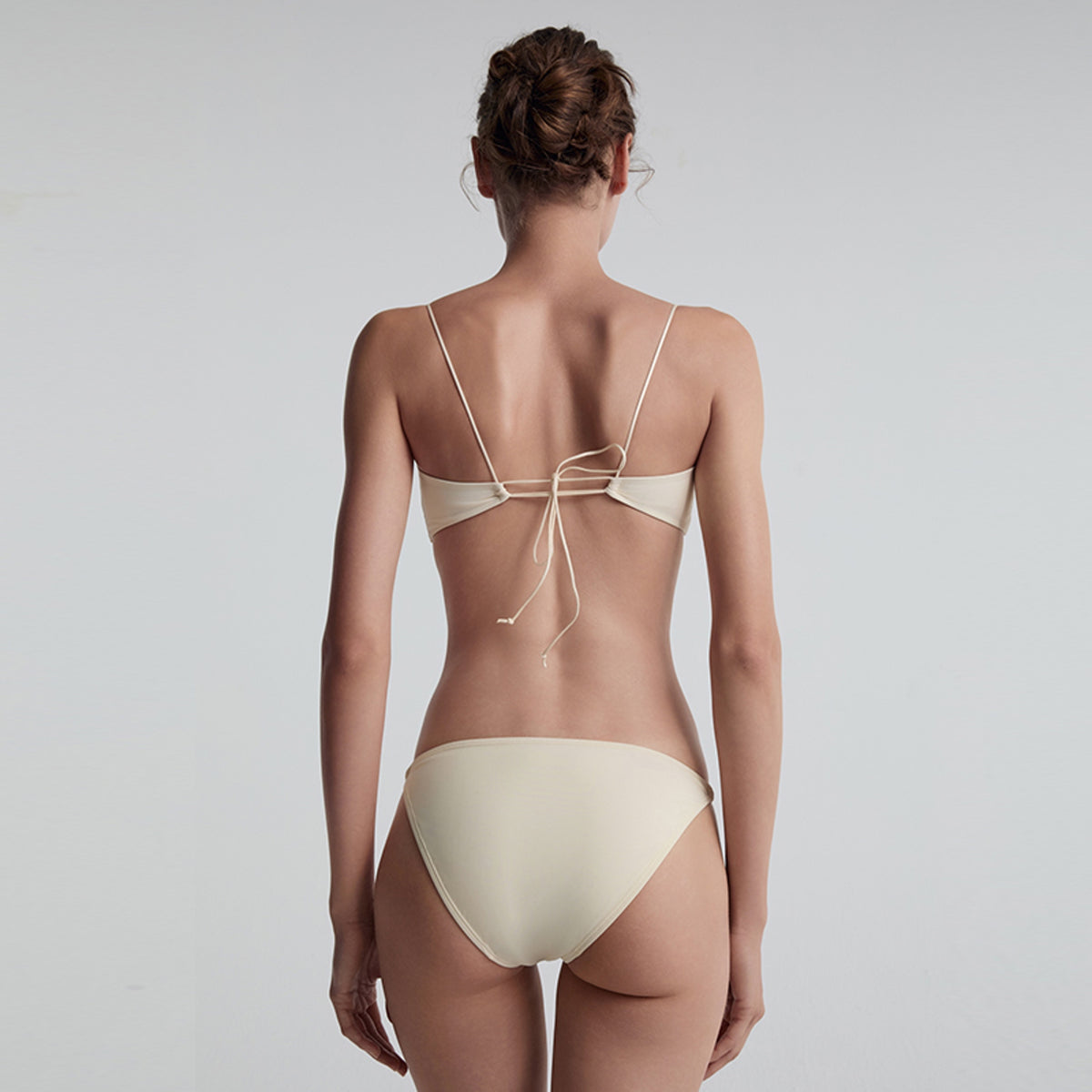 The adjustable thin straps offer a light, minimalist feel, while the Bauhaus-inspired design elegantly accentuates the lines of the shoulders and neck. Enjoying the sun and sand becomes a moment of pure comfort and freedom.