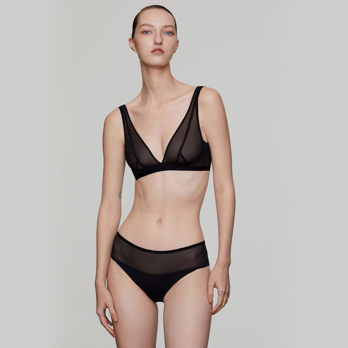 Smooth black lines trace the contours of the body, conveying a sense of simplicity and power. The Stretch mesh fabric, combined with wire-free design, offers a comfortable sensation, introducing a new experience in lingerie aesthetics.